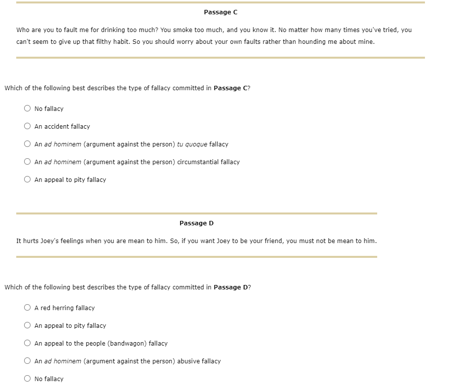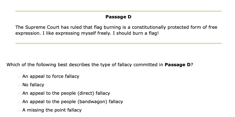 Or choose Valid Argument. If the passage is not fallacious choose no fallacy Passage A My opponent says we should respect the values that have guided us in the past and draw strength from them. An argument that draws a comparison between two unrelated items but the link is weak and cannot be supported.